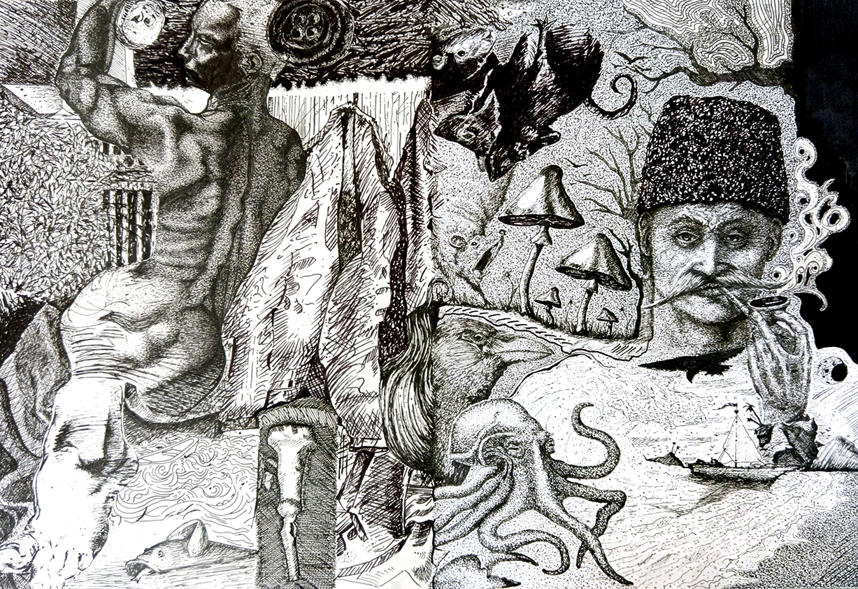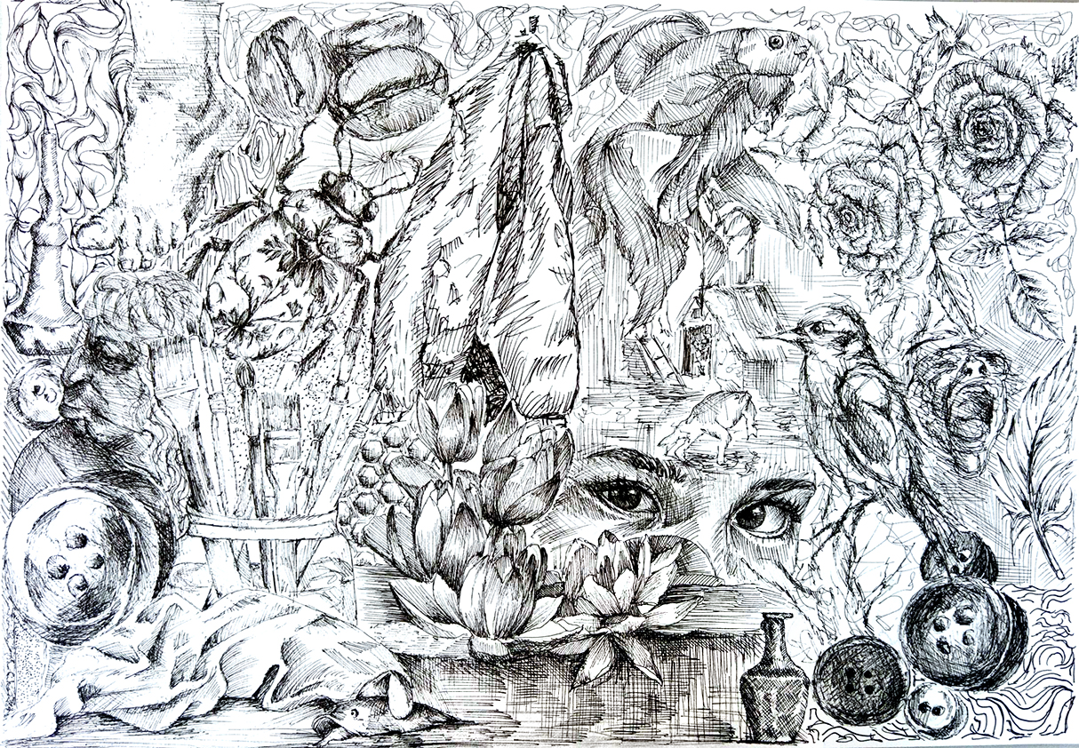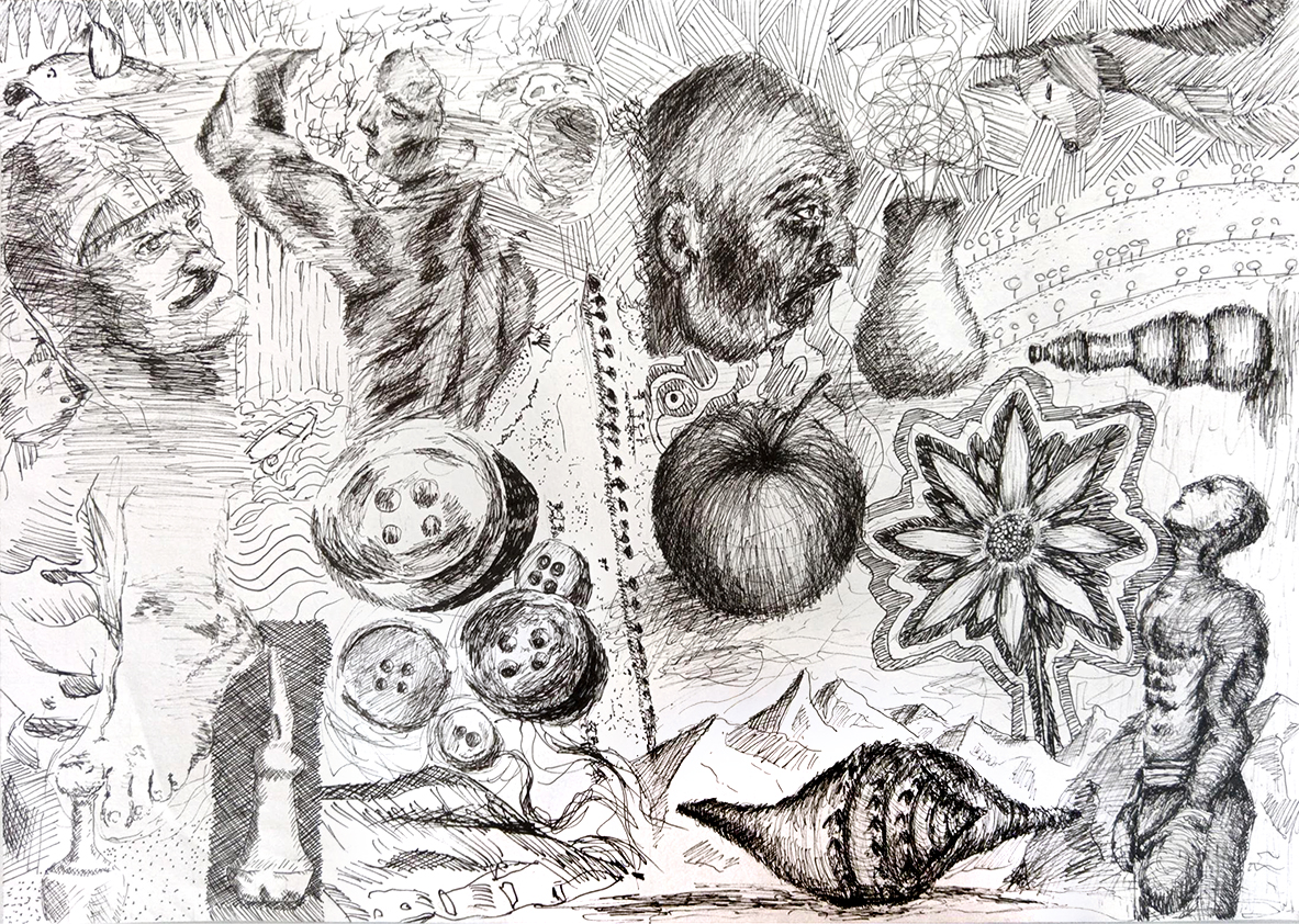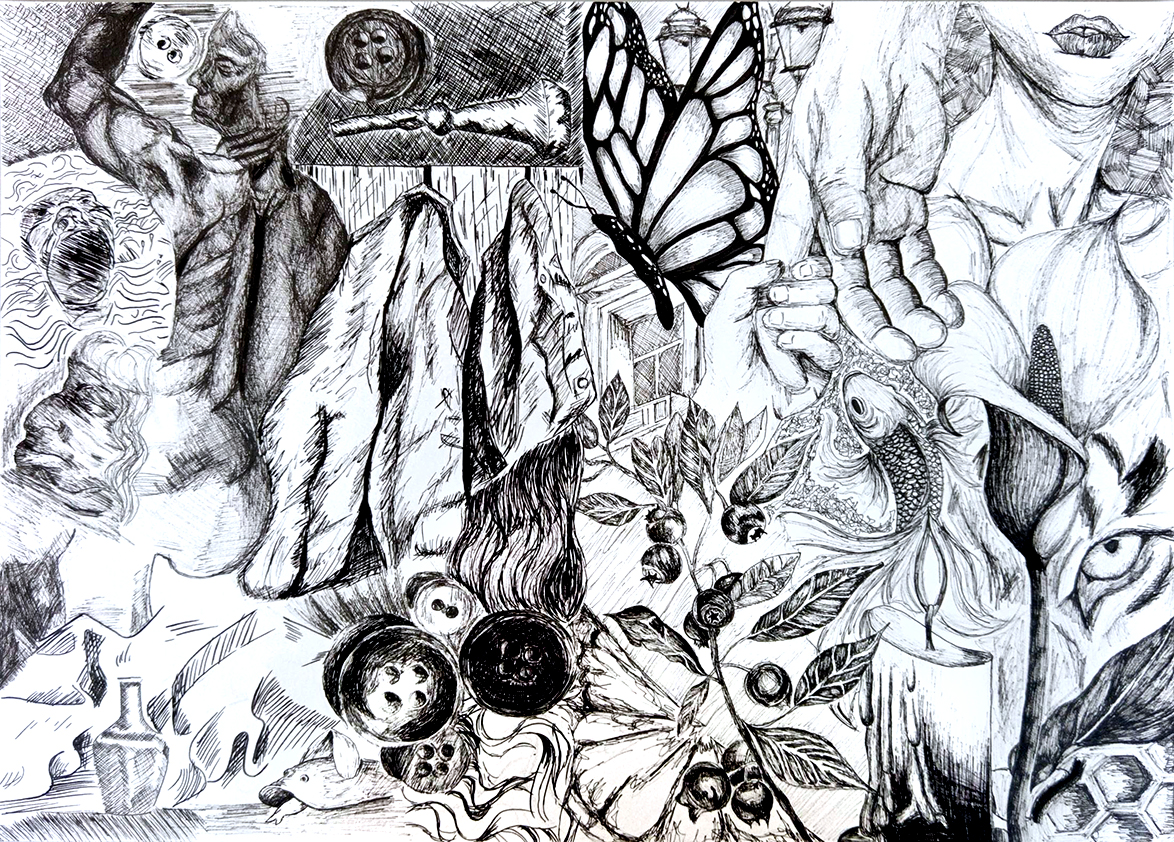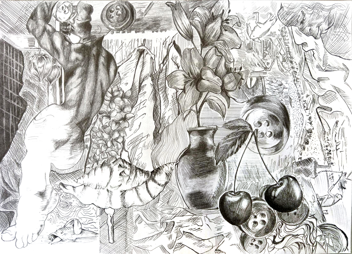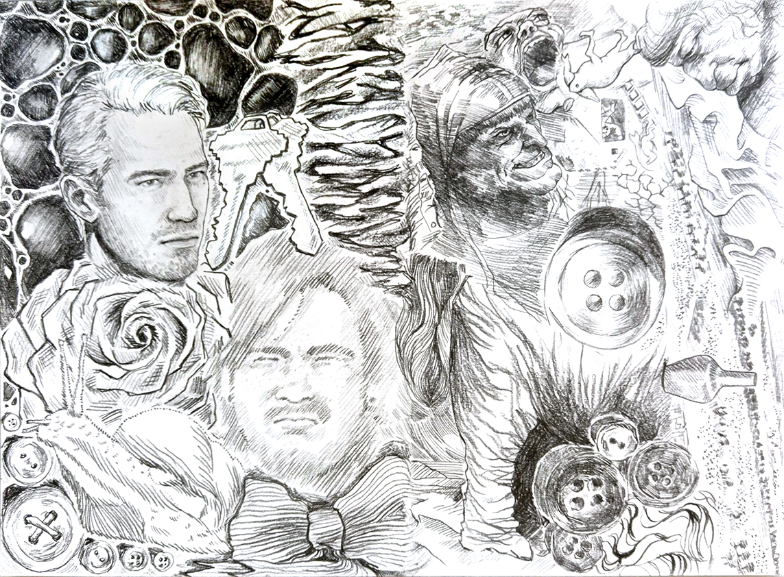 Ausgehend von einer Künstlercollage wurde die Hälfte der Vorlage im Maßstab 1:1 präzise nachgezeichnet und die andere Hälfte eigenständig ergänzt.